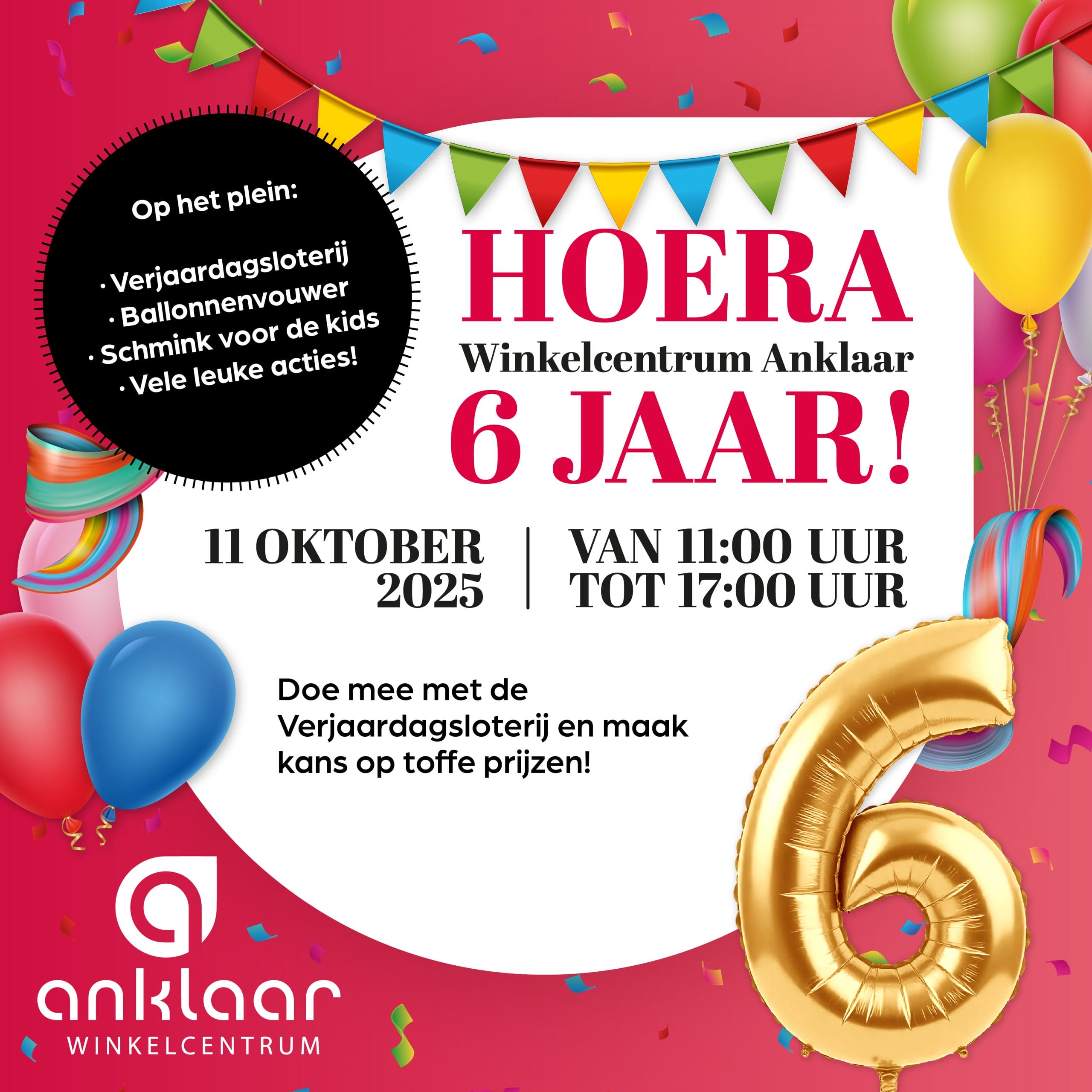 Zaterdag 11 oktober vieren we feest: Winkelcentrum Anklaar bestaat alweer 6 jaar! Dat laten we natuurlijk niet zomaar voorbijgaan. Van 11:00 tot 17:00 uur staat het hele winkelcentrum in het teken van feestelijke activiteiten, muziek en gezelligheid.